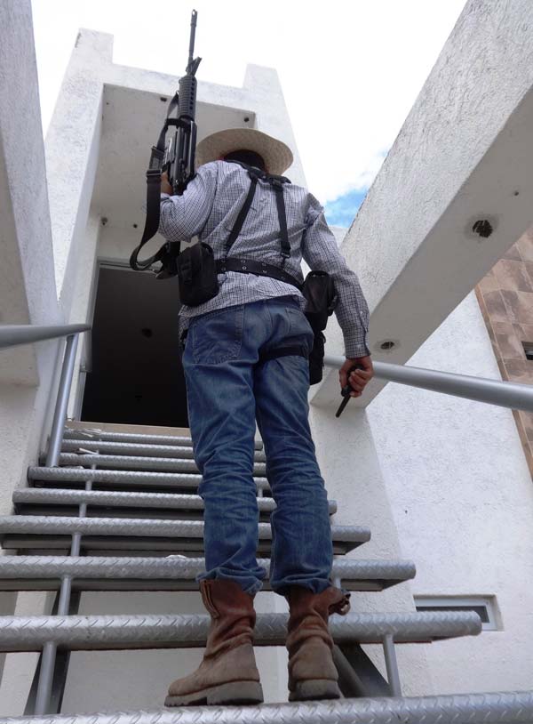Un cuerno de chivo de manufactura china cuesta en la región, precio estandarizado para autodefensas, narcotraficantes o la mezcla de ambas condiciones, unos 30 mil pesos, platica un hombre en el puesto de vigilancia. Cada bala cuesta alrededor de 30 pesos.