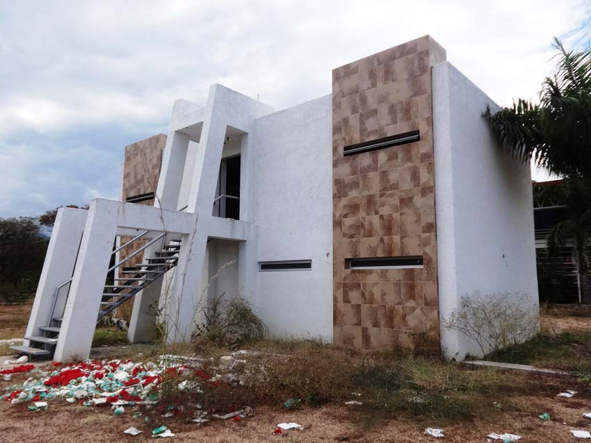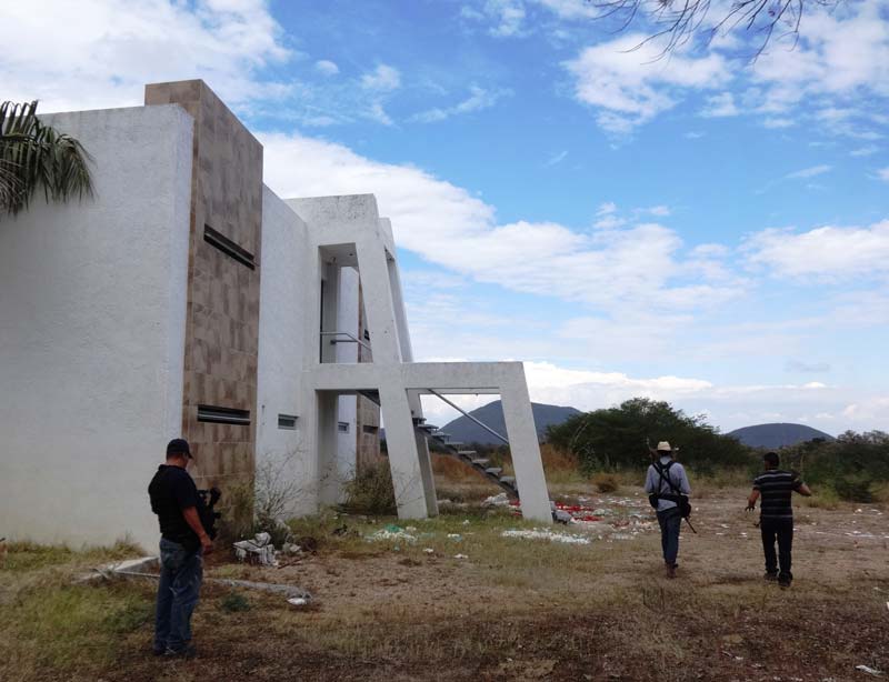 Una decena de edificios separados entre sí se distribuyen en cerca de tres hectáreas de terreno. Las construcciones permanecen intactas y su pintura blanca, reluciente. Son pocas las casas alrededor de La Fortaleza y ninguna se le parece. La zona aún es sobrevolada por aviones y helicópteros del ejército y la marina –Apatzingán, además de zona militar cuenta con una zona naval–, pero el sitio nunca fue asaltado por fuerzas de gobierno.