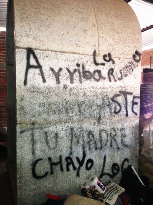 A un costado, se ven los edificios más grandes, ocupados como graneros. Nazario no sólo acaparaba el mercado de la marihuana, la amapola y las metanfetaminas en la región. Durante los últimos meses de su vida impuso que todo el maíz a la venta se le vendiera a él y que todo el grano disponible se comprara a él.