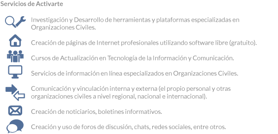 Activarte, sin embargo, es mucho más que un órgano de capacitación. Tiene también un programa de investigación, donde un equipo multidisciplinario trabaja constantemente en desarrollar las tecnologías que aún no existen, y que están pensadas específicamente en las necesidades de las organizaciones. Asimismo, esta asociación está inmersa simultáneamente en otras vertientes: un programa de digitalización, otro dedicado a la vinculación de movimientos con temas afines y un programa con alcance internacional dedicado a las redes sociales.