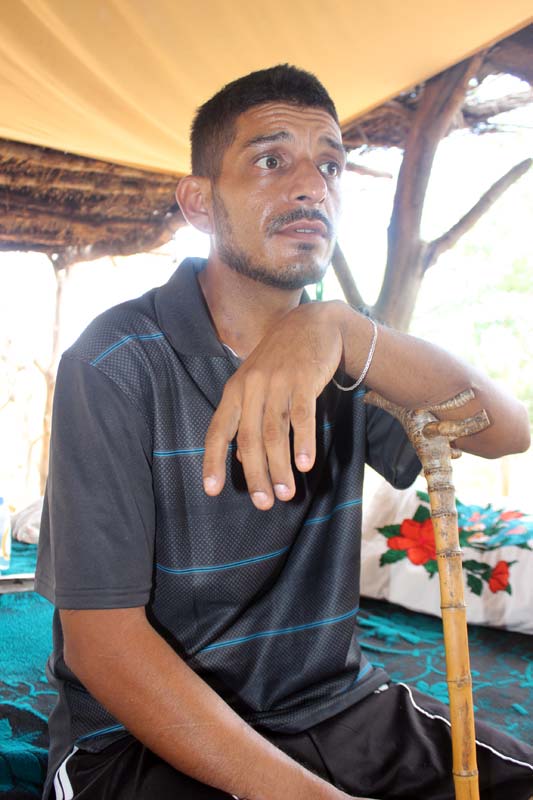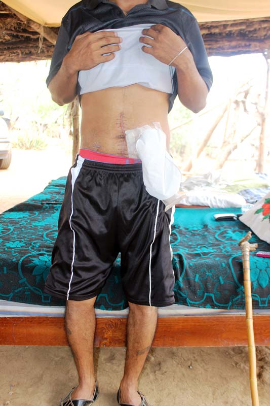 –A mí me dieron un balazo aquí atrás –Rafael Magaña Rivera gira para mostrar la parte baja de la espalda y hace una mueca de dolor– y me explotó acá, en la panza. Me cosieron las tripas y me hicieron un bujero. Apenas me va sanando donde tenía la sonda... y la operación la tengo desde acá y hasta acá. Y aquí, por aquí, es por donde hago del baño. Me van a volver a operar de aquí. “¡Mire!: Todo el tripaje lo traigo rompido”.