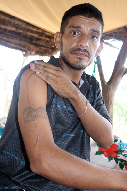 –Esa noche –sigue Rafael–, ya cuando nos tiraron los fierrazos, nos aventamos de la camioneta pa' abajo y fue cuando me pegaron el balazo aquí atrás. Era una bala expansiva y me explotó adentro, por eso me rompió todas las tripas. Caí destripado y me atoré el brazo con el alambre de púas de una cerca.
