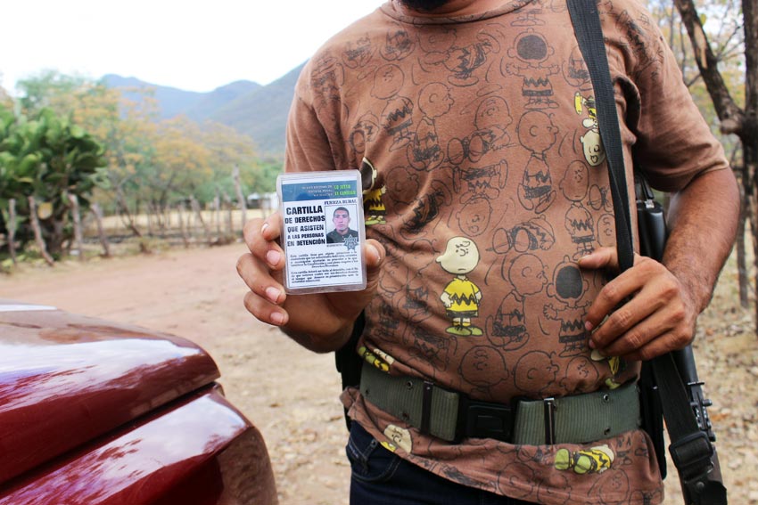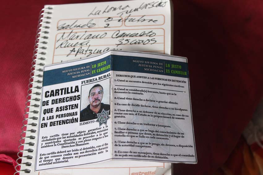 “Sí, fui de la Fuerza Rural en Sandoval. Apenas me habían dado mi credencial. Me sacaron la foto en Apatzingán, con el patrón, Papá Pitufo. Apenas traébamos el papelito, nos habían dicho que la enmicáramos y en eso andábamos. Nomás queríamos agarrar un dinerito pa' ir y enmicarla pa' que no se nos maltratara. Y ese día yo la traía ahí en mi morralito y ahí cuando pasó eso pues ahí se quedó todo en la camioneta porque nosotros salimos corriendo pa' un lado”.