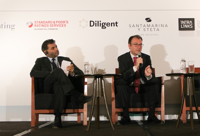 En su intervención, Luis Videgaray aseguró que los principales retos que enfrenta la economía mexicana son las complejas condiciones externas, la disminución a nivel mundial del "apetito" por el riesgo, además de la caída en el precio del petróleo.