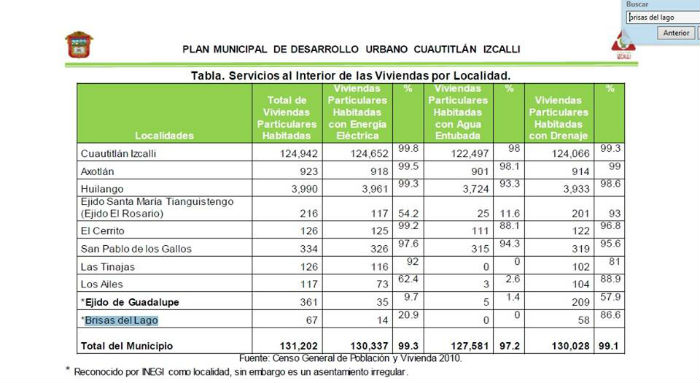A pesar que la abogada Bárbara Castro Felix, quien supuestamente es apoderada de Banorte, aseguró que Brisas del Lago –con código postal 54720- es un predio de un particular, el municipio de Cuautitlán Izcalli, el Instituto Nacional de Estadística y Geografía (Inegi), la Secretaría de Desarrollo Social (Sedesol) y el Consejo Nacional de Evaluación de Política de Desarrollo Social (Coneval) tienen este lugar registrado como una localidad con asentamiento irregular, inclusive hay proyectos de escuelas, guarderías y hasta hace poco había una iglesia.