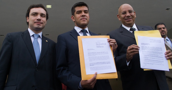 Ciudad de México, 9 de abril (SinEmbargo).- Los diputados federales del Partido Acción Nacional (PAN) Juan Pablo Adame Alemán y Fernando Rodríguez Doval, acompañados por el represente de la fuerza política en el Instituto Nacional Electoral (INE), Francisco Gárate Chapa, presentaron una queja contra el Partido Verde Ecologista de México (PVEM) por la entrega de propaganda ilegal.