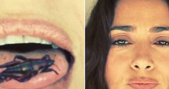 En el vídeo se ve cómo Salma posa, con un grillo muerto sobre su lengua y, sin pensárselo dos veces, lo mastica sin pudor, mientras explica a sus fans que se trata de un insecto comestible de Oaxaca. Foto: Especial