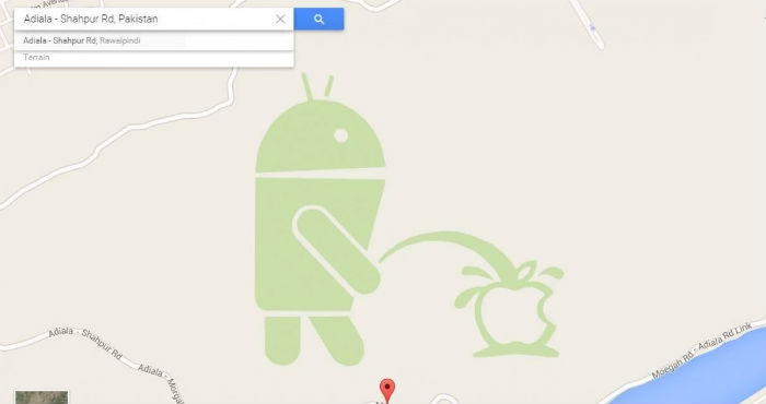 Ciudad de México, 24 de abril (SinEmbargo).- A través de un mensaje oculto en Google Maps -en las coordenadas "33°30'52.5%22N+73°03'33.2%22E"- se podía apreciar una imagen del robot del sistema operativo Android orinando el logo de la empresa tecnológica Apple.