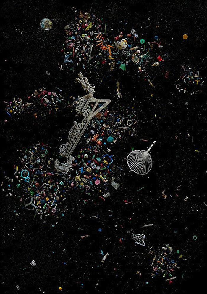 Cierto, la composición lleva consigo una gran carga de artificialidad, pero también remite a imágenes tomadas por submarinos, con una gama de colores poco naturales y formas extrañas. Al mismo tiempo, no deja de ser una representación cruel de las estadísticas inquietantes de los plásticos que se encuentran dispersos en todos los mares y cuya presencia no tiene límites.