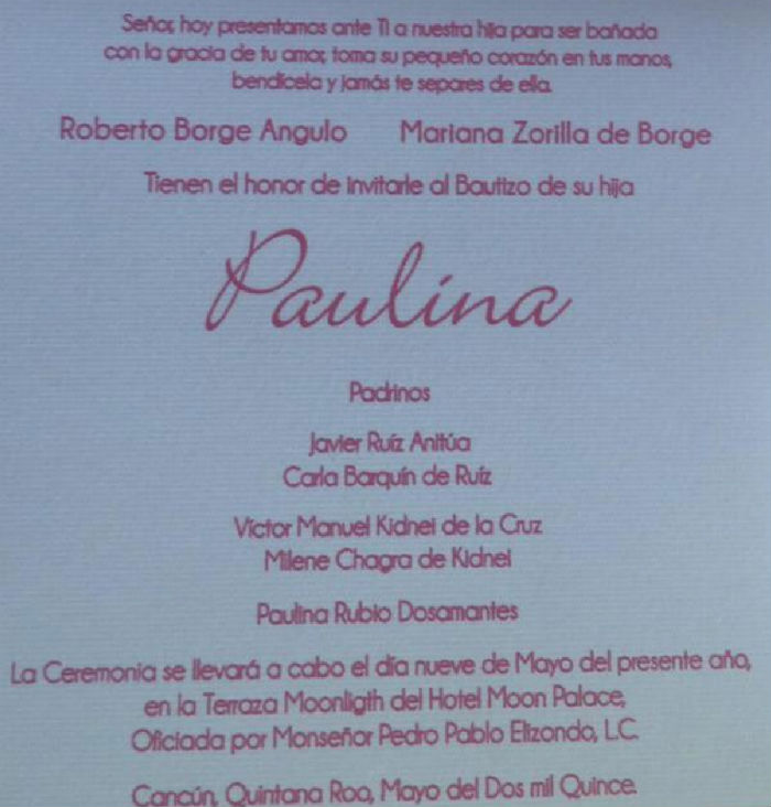 Ciudad de México, 11 de mayo (SinEmbargo).– Usuarios de redes sociales por medio del hashtag #bautizopaulina criticaron al Gobernador de Quintana Roo, Roberto Borge Angulo y a su esposa Mariana Zorilla de Borge, luego que realizaron el bautizo de su hija Paulina con una fiesta de cientos de invitados, entre ellos famosos, incluyendo a la madrina Paulina Rubio Dosamantes.