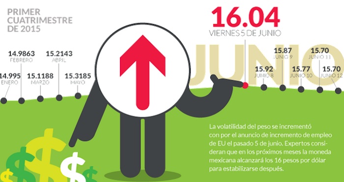 El 5 de junio pasado, la moneda mexicana cayó a un nivel mínimo histórico al cerrar en 16.01 pesos por dólar. La baja respondió a que el billete verde se fortaleció después de que el Gobierno de Estados Unidos anunció la creación de 280 mil nuevos empleos, más de los previstos por especialistas, lo que generó incertidumbre entre los inversionistas ante la probabilidad de que la Reserva Federal (Fed, por sus siglas en inglés) aumente la tasa de interés de referencia en ese país antes de septiembre, lo que nuevamente fortalecería al dólar frente a la moneda nacional.