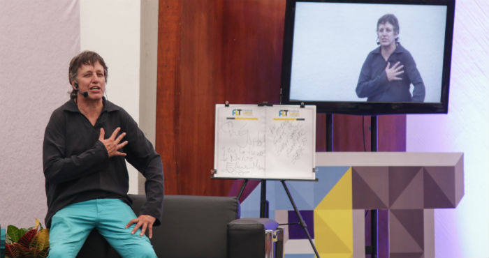 En medio de la fiesta literaria, llega Xavier Velasco, vestido sobriamente con unos pantalones color turquesa, un buzo azul y su proverbial carácter expansivo, para ser presentado por la escritora local Lourdes Pacheco y luego hablar, a ritmo de stand up, de “mis queridos autores”.
