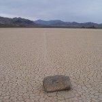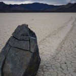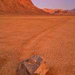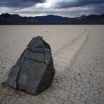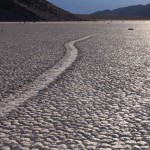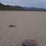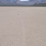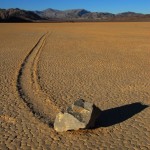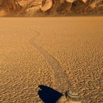 Se les conoce como “piedras viajeras”, “piedras rodantes” o “piedras móviles”. Se mueven en sendas que van marcando con su propio paso sobre el suelo liso, sin intervención humana o anima, en la Playa Racetrack del Valle de la Muerte, California.