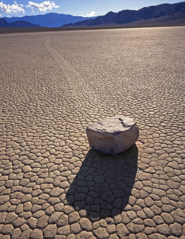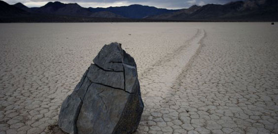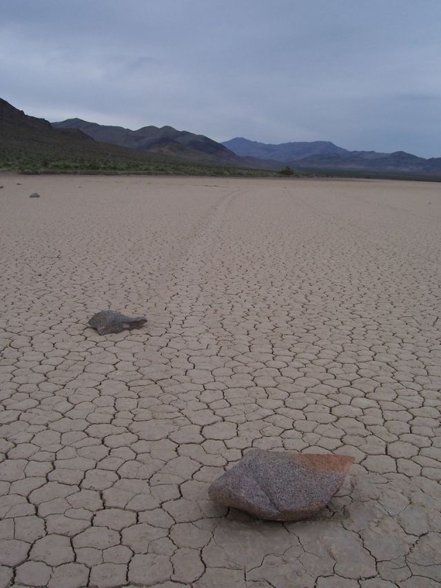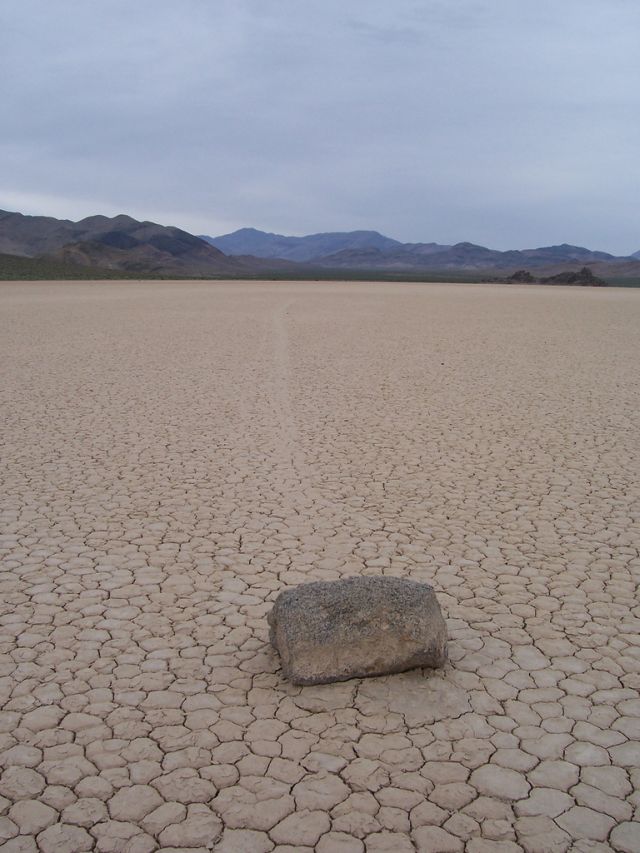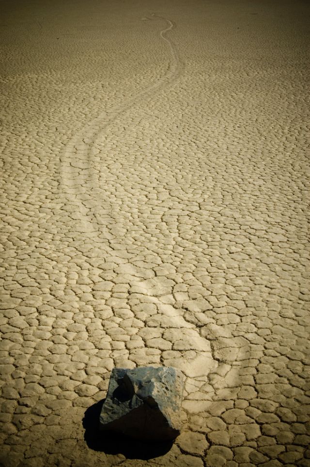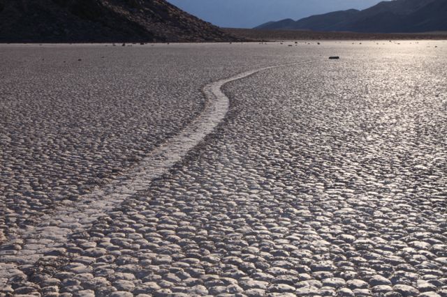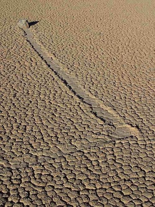 Se les conoce como “piedras viajeras”, “piedras rodantes” o “piedras móviles”. Se mueven en sendas que van marcando con su propio paso sobre el suelo liso, sin intervención humana o anima, en la Playa Racetrack del Valle de la Muerte, California.
