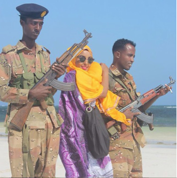 La bloguera Ugaasadda junto a agentes somalíes en una playa. Foto: Instagram @ugaasadda