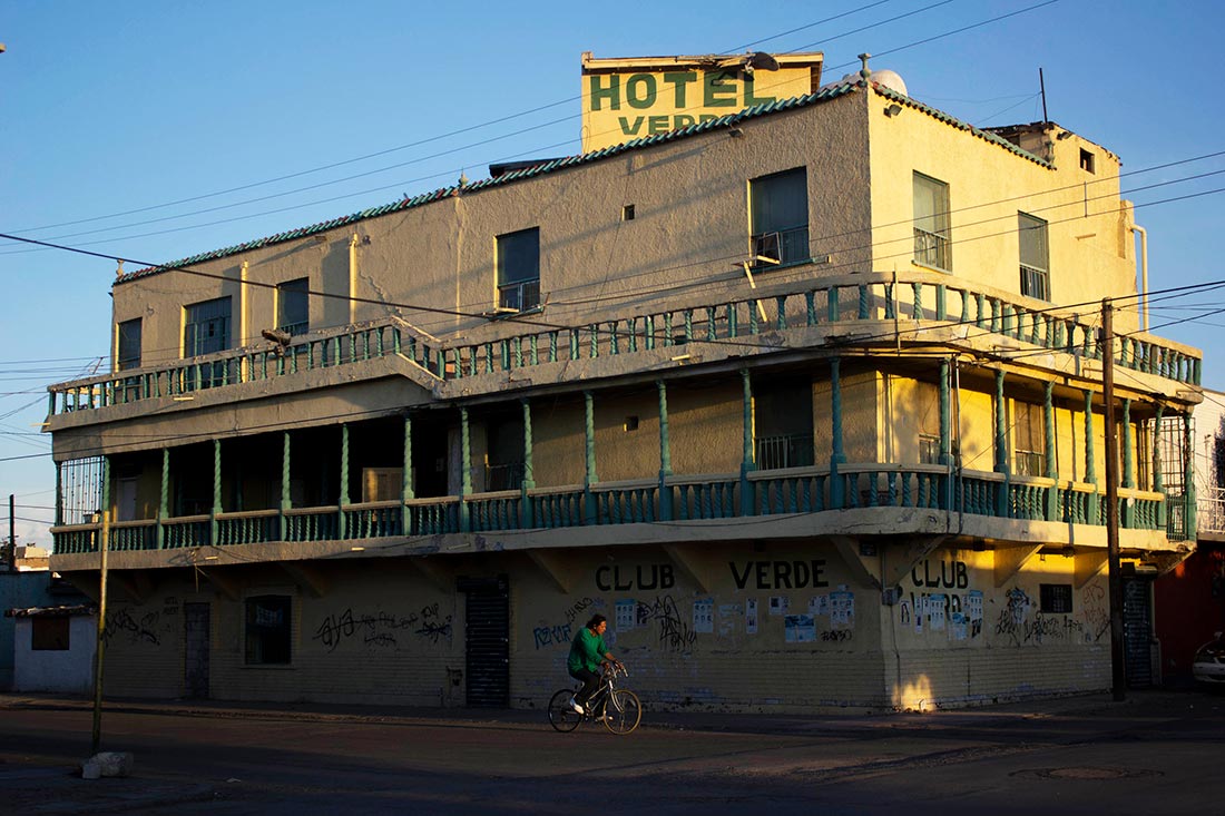 El tercer punto crítico del crimen identificado en el juicio, con base en las pistas encontradas desde 2010 por las familias, es una negociación denominada Hotel Verde, un edificio de tres pisos ubicado seis cuadras al norte de la vecindad, en el cruce de las calles Mariano Samaniego e Ignacio Manuel Altamirano, en la colonia Bellavista, ya casi frente al río Bravo. Ahí, de acuerdo con diversos testimonios presentados en el juicio, entre 2008 y septiembre de 2010 fueron vistas las víctimas, algunas intoxicadas con un disolvente conocido como “agua celeste” –identificable porque se inhala a través de un trapo– y todas ofreciendo servicios sexuales. Entrevistas recabadas entre los vecinos completan un panorama en el que, en ese periodo, los años más violentos y de mayor cantidad de elementos armados patrullando, entre la Ignacio Manuel Altamirano y la parte oeste de la avenida Juárez, entre las tapias, vecindades y baldíos, caminaban decenas de jovencitas ejerciendo la prostitución. Hombres vigilando son parte también de lo que se describe. “Se veía que eran menores. Venían señores de El Paso y se las llevaban, pero eran muchachitas”, dice una persona entrevistada en los alrededores del hotel. “Había un padrote ahí que les daba droga, y la recepcionista también, se las vendía, y ahí andaban, en traje de baño”, agregó el testimonio a SinEmbargo.