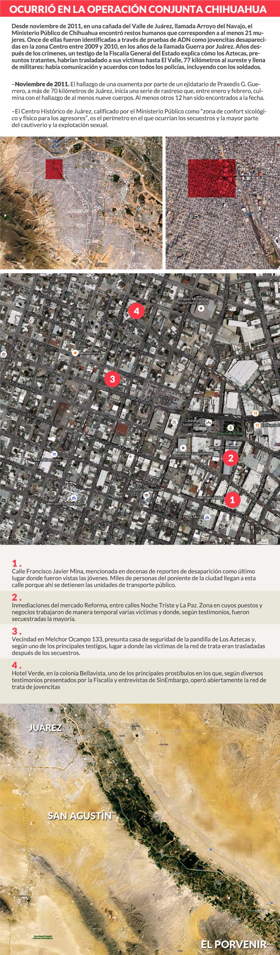 En la entrevista, el abogado González explica que algunos acusados de esta presunta red de trata, como Manuel Vital Anguiano, aparecen en las denuncias de desaparición de mujeres que se han registrado desde al menos 1995 en la zona Centro de Ciudad Juárez. Pero si esta problemática aumentó por decenas en los años de la disputa armada por el territorio del crimen organizado, agrega el abogado, el diagnóstico es que fueron secuestradas y prostituidas para satisfacer las demandas sexuales de todos los que participaron en la ola de ejecuciones.