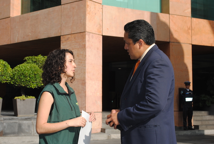 Greenpeace externó en un pergamino gigante frente al edificio de Grupo Herdez su interés por que las empresas transparenten esta información.