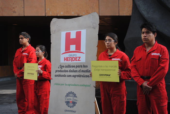 Ciudad de México, 10 de julio (SinEmbargo).- La organización internacional Greenpeace denunció frente a las instalaciones del Grupo Herdez la falta de transparencia que tiene la empresa para informar sobre el uso de agrotóxicos que conllevan sus procesos de producción de alimentos, los cuales están en el 50 por ciento de los hogares mexicanos, estimaron datos de los activistas.
