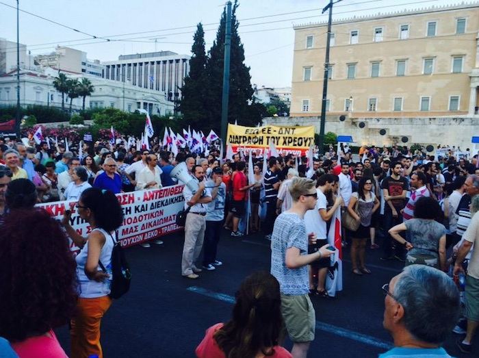 A la concentración, convocada a través de Facebook por la plataforma que secundaba el "no" en el referéndum, acudieron entre 8 mil y 9 mil miembros de PAME, el sindicato del partido comunista griego, y en torno a unos mil pertenecientes a partidos de la izquierda extraparlamentaria como Antarsya, según cifras de la policía.