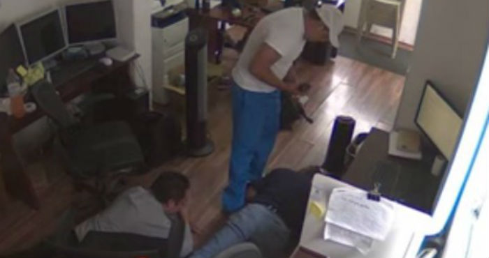 Arcos subió a la red social un grabación hecha con una cámara de seguridad de su oficina, y en la que se observa a un sujeto vestido con ropa deportiva y portando un arma de fuego, y quien después amagan a los empleados del establecimiento y los despoja de sus pertenencias.