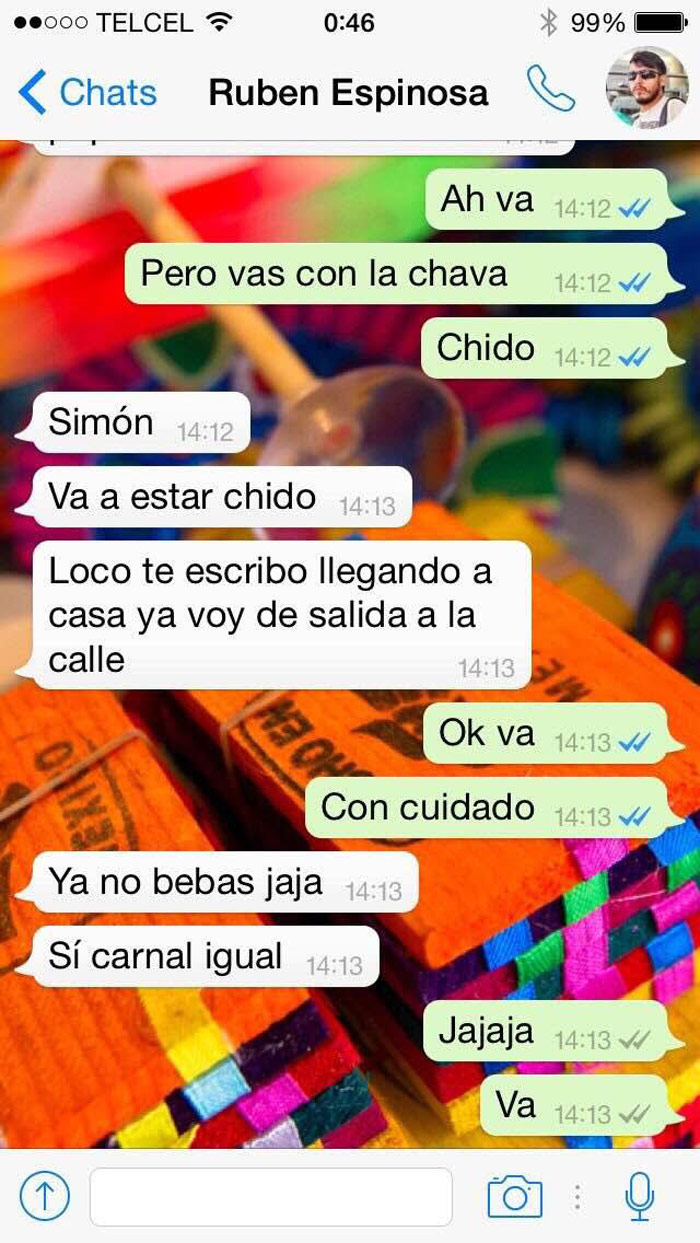 –Hoy tengo guardia con AVC (medio en Veracruz con el que también colaboraba). Voy a eso a mi casa –dice Rubén a las 14:11. “Mañana salgo temprano a Puebla. Voy a acompañar a mi chava a una consulta y ver a sus papás”, agrega un minuto después.