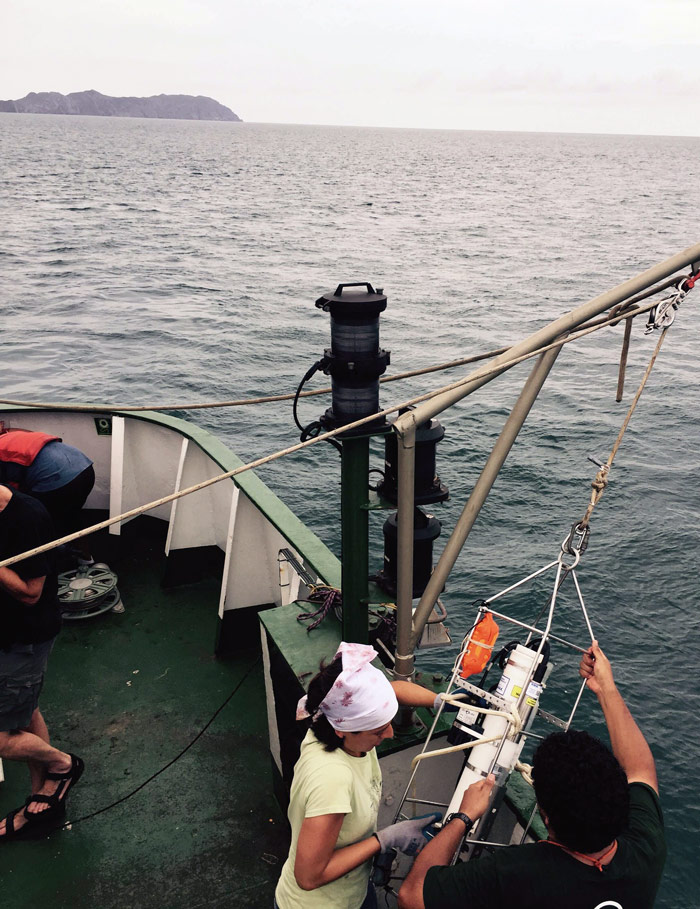 “Tomamos distintas variables. Medimos las condiciones de hidrografía de la columna del agua: cómo está la temperatura, la salinidad; con aparatos medimos luz, florescencia, oxígeno. Eso nos mide la estructura de la columna”, dice García Mendoza. “Uno ve el mar y piensa que es homogéneo. Pero no lo es. Las mediciones van levantando, desde la profundidad, temperaturas y condiciones para que vivan los microorganismos”, agrega.
