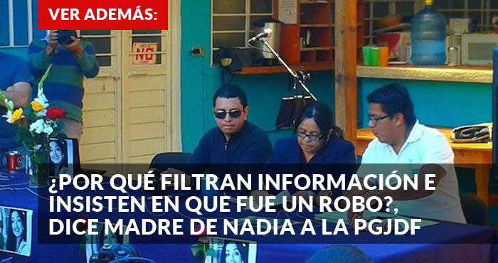 Ayer, Mirtha Luz Pérez Robledo, madre de la activista Nadia Vera, cuestionó a la Procuraduría del Distrito Federal por el manejo que ha dado al asesinato de su hija, del fotoperiodista Rubén Espinosa Becerril, de Yesenia Quiroz, Olivia Alejandra Negrete Avilés y la colombiana Mile Virginia Martínez.