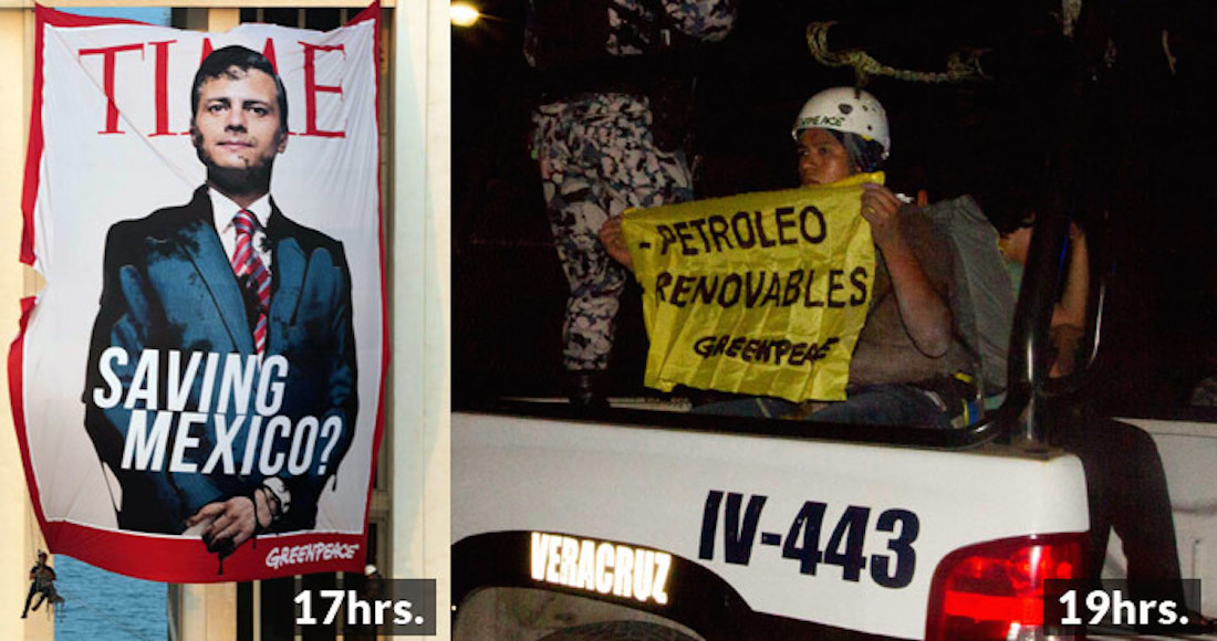 Ella estaba allí el sábado 1 de marzo de 2014. Javier Duarte de Ochoa iba a inaugurar el Carnaval de Veracruz y tocarían Los Tigres del Norte cuando, a las 5 de la tarde, seis activistas de la organización aguadaron su fiesta. Ingresaron a la Torre de Pemex del puerto para colocar una manta con aquella vergonzosa portada de Time, la de Peña Nieto “salvando a México”. El “banner” (como le llaman en Greenpeace) agregaba un signo de interrogación al final: “Saving Mexico?”. El Presidente aparecía chorreando petróleo.