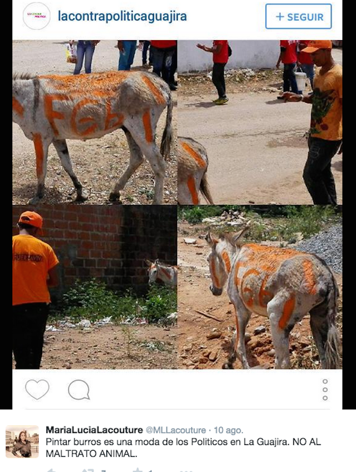 El caso del burro que promocionaba a Pablo Parra no es único en la región, otro de estos animales fue pintado, también esta semana, ahora con propaganda de Fabiola Veláasquez, que también compite por el cargo. Ante esto, la denunciante del primer caso se manifestó también en redes y pidió "a los candidatos políticos de La Guajira tener control sobre este tipo de abusos contra los animales". "Esto no es normal. Porq en La Guajira lo ven normal? NO AL MALTRATO ANIMAL (sic)", apuntaba otra de sus publicaciones.