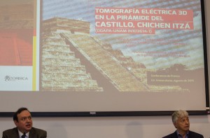 MÉXICO, D.F., 13AGOSTO2015.- Arturo Iglesias Mendoza, director del Instituto de Geofísica de la UNAM, y René Chávez Segura, investigador de la misma institución, presentaron los resultados de la investigación en el templo de Kukulcán, en donde descubrieron la existencia de un cenote debajo del templo, a través de una tomografía eléctrica 3D en la pirámide del Castillo.