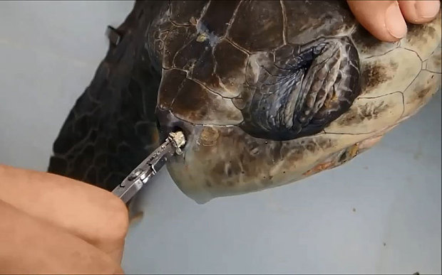 A bordo de una embarcación, los científicos británicos le retiraron el popote de la nariz a la tortuga y grabaron todo el suceso en un video que contiene fuertes escenas.