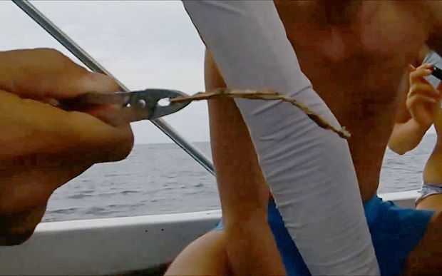 Después de debatir qué hacer, decidieron quitarlo con una navaja suiza, la única herramienta que tenían disponible en el barco. Además, tuvieron que utilizar pinzas para quitar el popote.