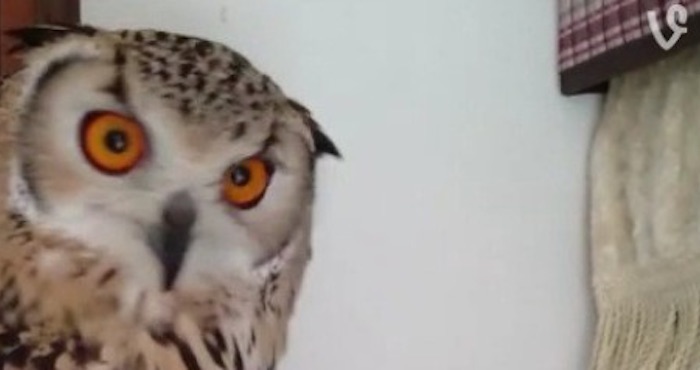 Búho frente a búho. El de carne y hueso y el pintado en el cojín. Y la cara de póquer del pobre animal.