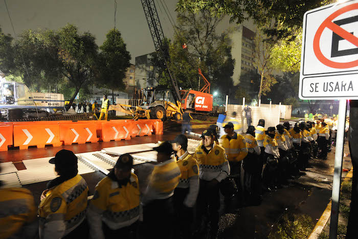 En imágenes difundidas por los vecinos, tomadas durante la madrugada, se aprecia a agentes de Tránsito en la zona de la obra. Sin embargo, los vecinos acusaron que se trataría de granaderos disfrazados, como expresó Francisco Rodríguez, vecino de la Delegación.