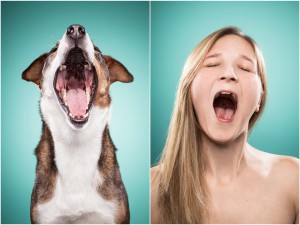 PIC BY INES OPIFANTA / CATERS NEWS - (PICTURED: Maria and Giocco the dog.) BARKING mad owners have proven they really do look like their pets - by performing hilarious impressions of their own DOGS. In a series of hysterical PAW-traits owners including men, women and children pull their best faces to look like their pooches. Snapped by photographer Ines Opifanta, 29, people stuck their tongues out, yawned and tilted their heads in curiosity at the camera. Keen snapper Ines, from Hamburg, Germany, came up with the idea while interacting with her own dogs - two pug x French bulldog crossbreeds. SEE CATERS NEWS