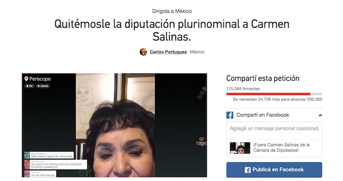 Ciudad de México, 20 de septiembre (SinEmbargo).– La petición lanzada hace dos semanas en Change.org que exige retirar la diputación a la actriz Carmen Salinas Lozano, acumula más de 175 mil firmas.