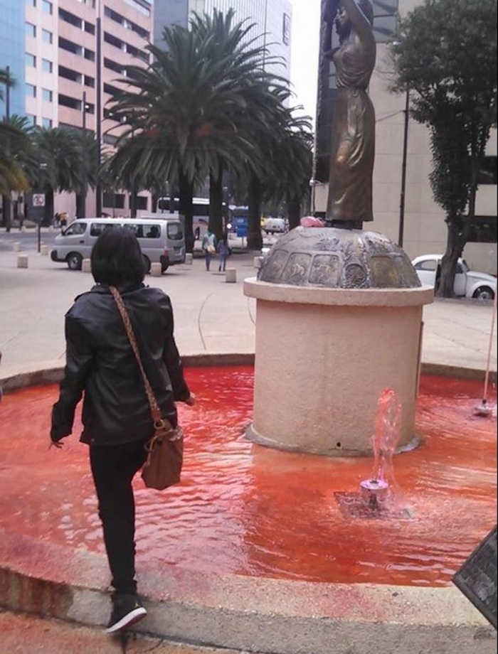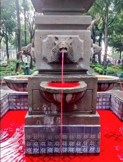 Ciudad de México, 26 de septiembre (SinEmbargo).- El agua que brota de algunas fuentes de la Ciudad de México fue teñida de rojo como parte de las manifestaciones a un año de la desaparición de los 43 normalistas de Ayotzinapa.
