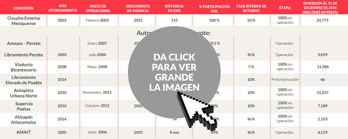 En febrero de 2003, OHL ganó la licitación para construir el Circuito Exterior Mexiquense, obra que tuvo un costo total de 24 mil 921 millones de pesos y le otorga a la empresa el 50 por ciento de sus ingresos en México; a 2014, el promedio de vehículos que transitaron por esta vía fue de 283 mil 241 al día, con un costo promedio de 22.8 pesos.