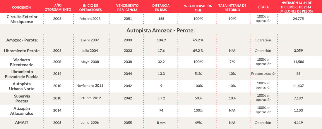 Los proyectos que tiene actualmente OHL en México le otorgan, anualmente, el 15 por ciento de sus ganancias a nivel mundial (524 millones de euros en 2013). Se trata de seis autopistas de peaje, de las cuales tres se encuentran en operación, dos en construcción y una en fase de pre-construcción, ubicadas en las zonas urbanas con mayor tráfico de vehículos –Distrito Federal, Estado de México y Puebla–, que en conjunto representan el 31 por ciento del Producto Interno Bruto (PIB) de México y el 27 por ciento de la población nacional que utiliza 8.6 millones de vehículos.