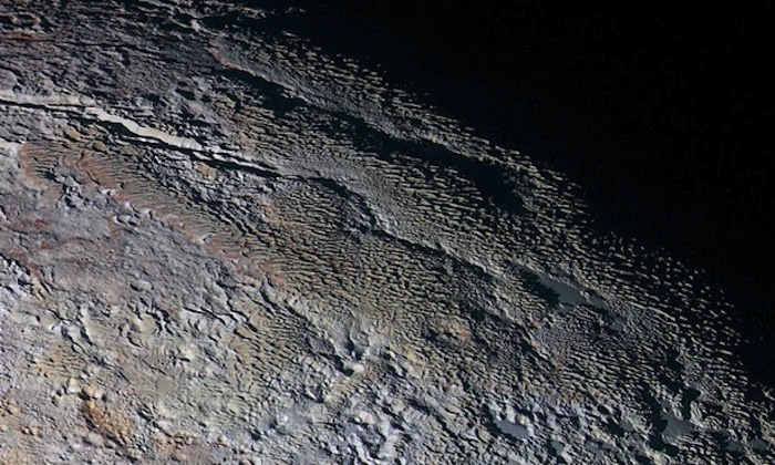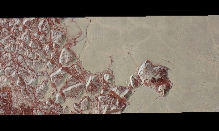 A lo anterior se suman fotos actuales que también muestran lo que Stern llama "vastos campos de características que se parecen a las dunas": la orilla de un lago glacial en desaparición y los acantilados fracturados y escarpados de montañas de hielo de agua. La atmósfera de Plutón es actualmente demasiado delgada para que cualquier viento forme dunas en las llanuras abiertas de este mundo, lo que quiere decir que el origen de los campos –que podrían estar hechos de hielo volátil, sedimentos, fragmentos de rocas pequeñas o algo más– sigue siendo desconocido.