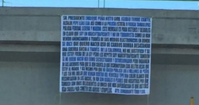 "Yo soy un traficante de drogas y no un terrorista", escribió Loisa en una narco manta que fue dirigida a los gobiernos federal, estatal y locales.