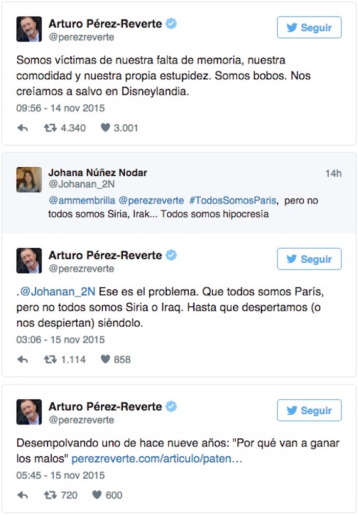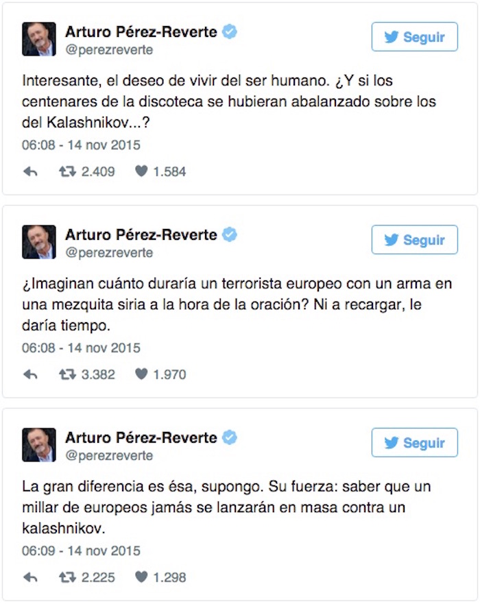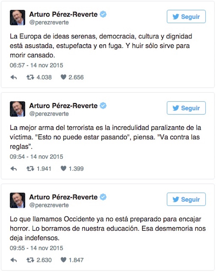 Ciudad de México, 15 de noviembre (SinEmbargo/The Huffington Post).-El periodista, escritor y académico Arturo Pérez-Reverte ha opinado en su cuenta de Twitter sobre los atentados de París... y ha causado polémica.