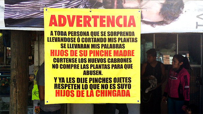 Mantas indican amenazas de parte de los vecinos. Se cuelgan en las esquinas y frente a las tiendas, locales de venta de pollo, ropa, farmacias y un sin fin de puestos que conforman el comercio local.