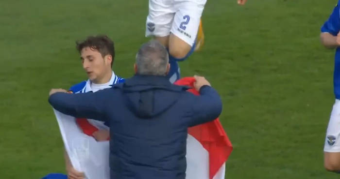 Morosini que anotó el segundo gol de su equipo en la goleada ente el cuadro del Trapani corrió emocionado hacia la banca para tomar la bandera y secar sus lagrimas.