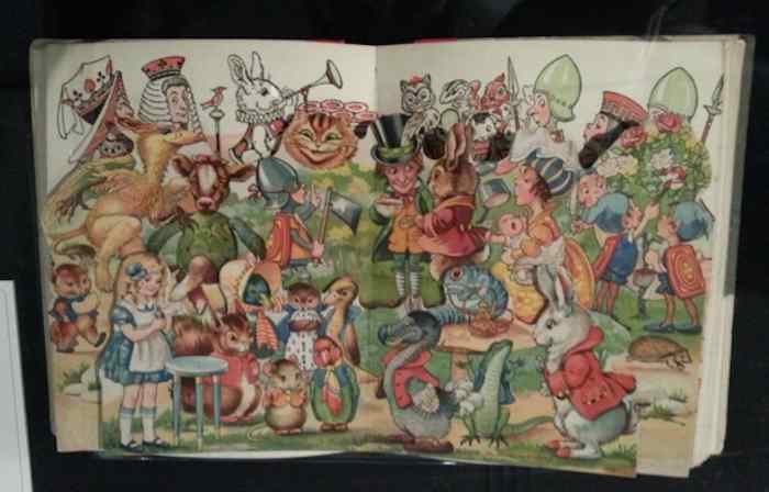La muestra incluye las dos primeras ediciones de Carroll ilustradas por John Tenniel, entre ellas la que fue retirada debido a que el autor y el ilustrador no estaban satisfechos con la calidad de los dibujos.