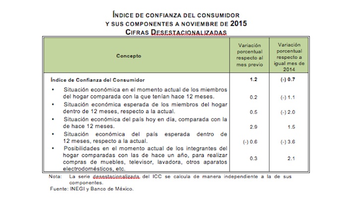 En su comparación anual, el ICC registró durante el penúltimo mes de 2015 una disminución de 0.7 por ciento en términos desestacionalizados.