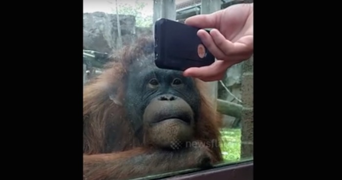 En la grabación se ve que pese a que la mujer que le muestra el teléfono comienza moverlo, el orangután jamás deja de ver el video.