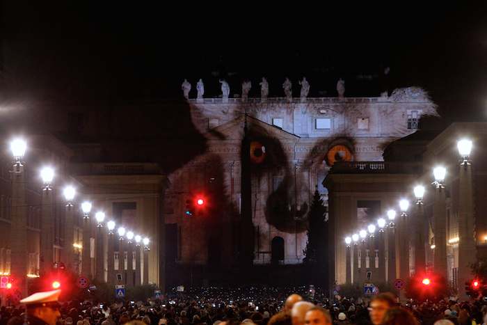 Así, imágenes en movimiento gracias a juegos de "zoom" y efectos de luces permitieron que grandes cascadas cayeran sobre los muros de granito y mármol de la fachada de la basílica vaticana.