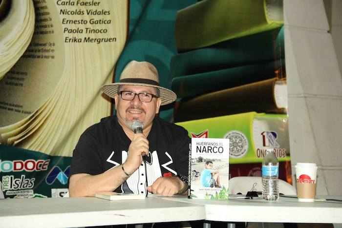 El escritor Javier Valdez durante la presentación de su libro Los huérfanos del narco. Foto: Facebook Feliart Mazatlán